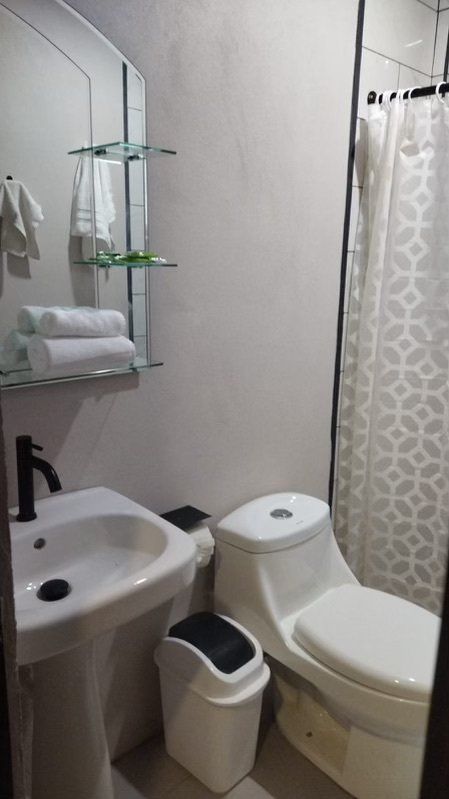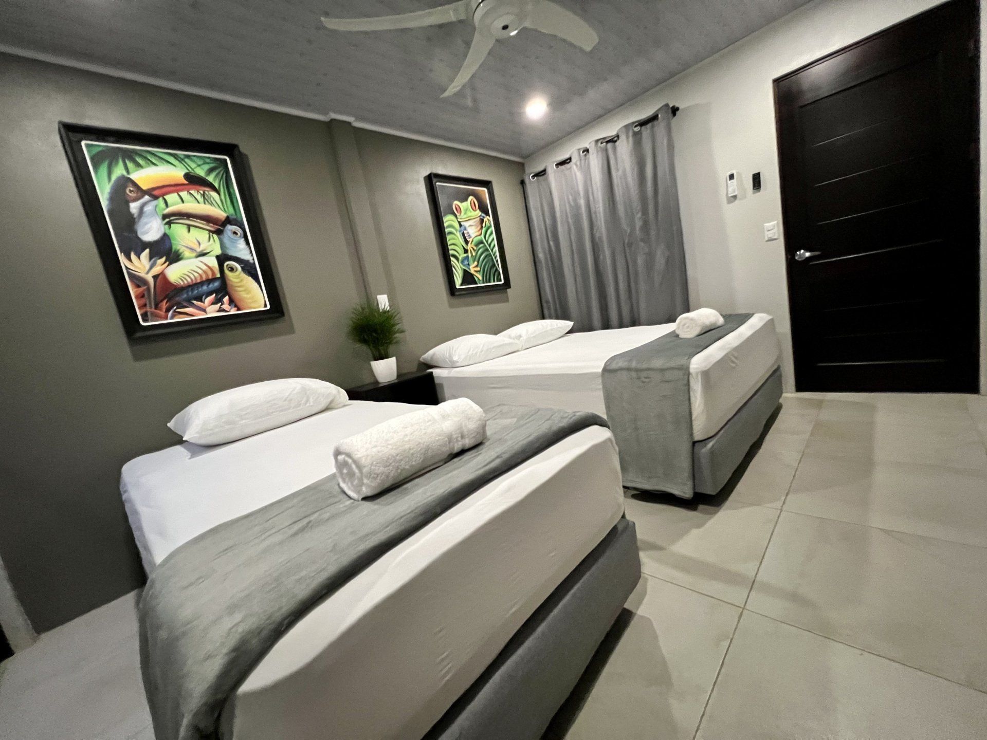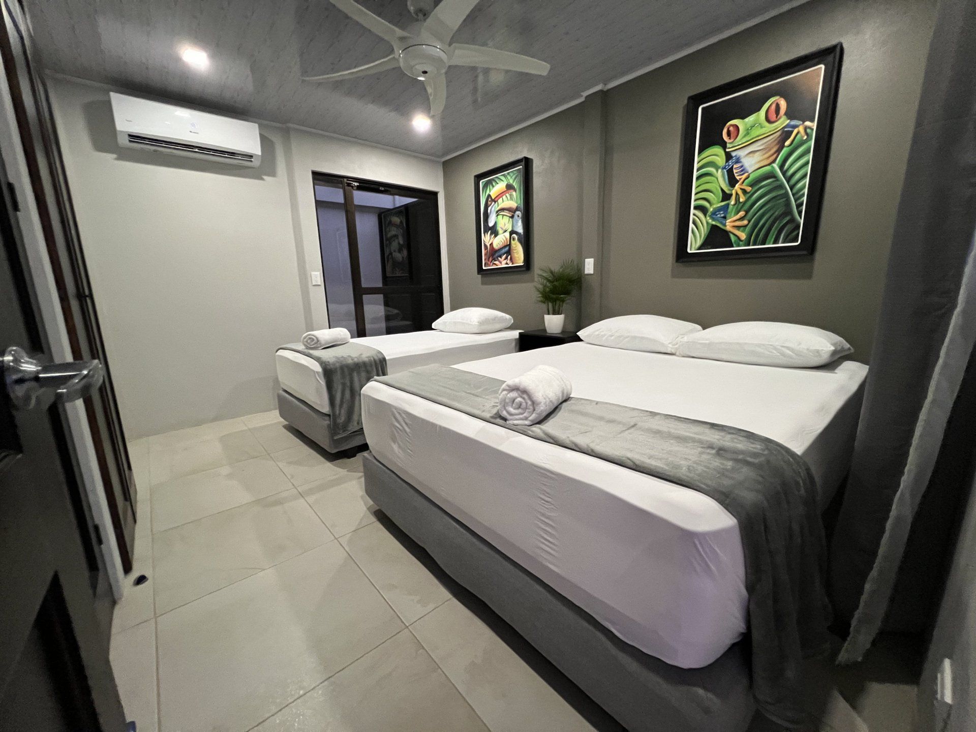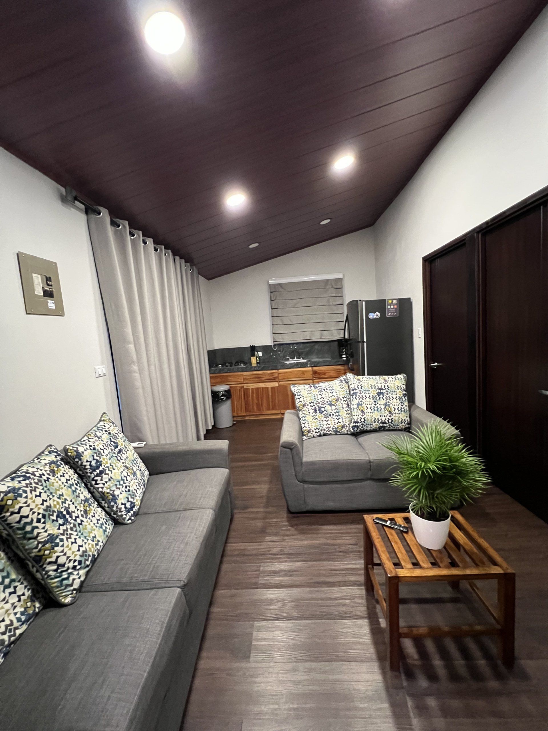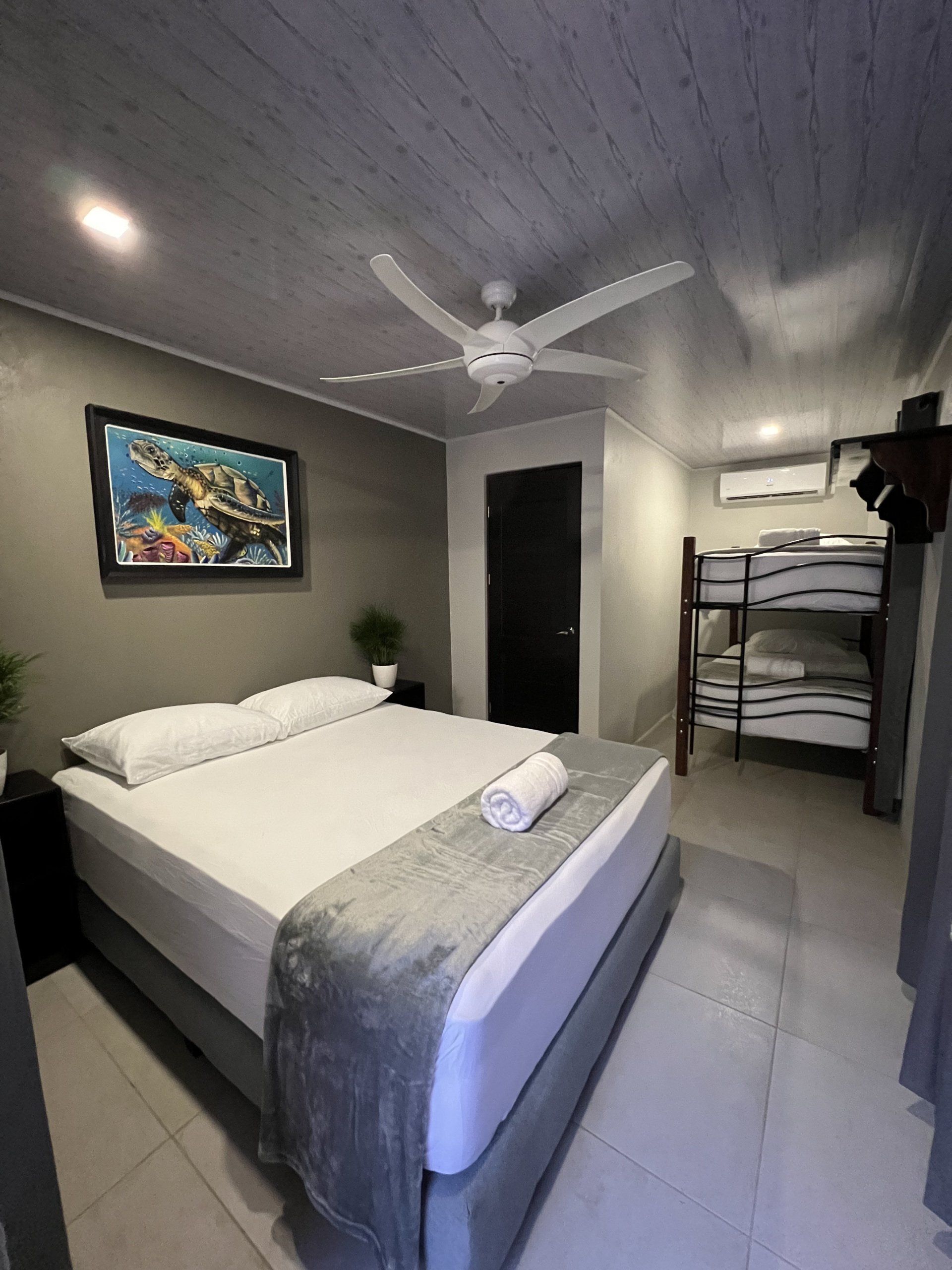 The apartment is 442 square feet or 41 square meters, it has 2 bedrooms; 1 bedroom with a queen bed and the second bedroom with 1 twin bed and one set of bunk beds. The apartment can accommodate up to 5 people, has a large private bathroom, fully equipped kitchen, and a beautiful patio with a bar and seating that overlooks the main street in Dominical.The apartment also has a private gate entrance.